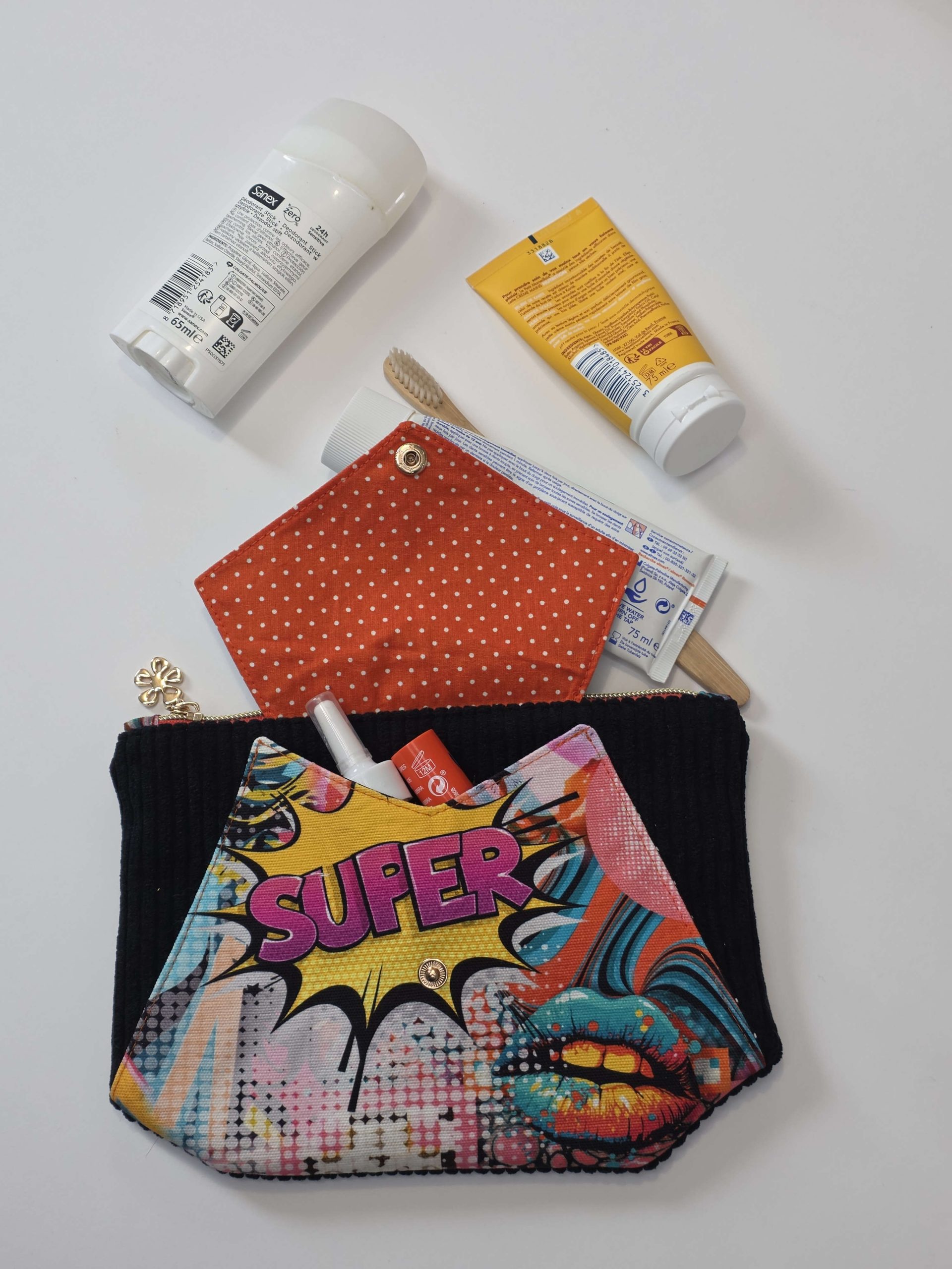 - Une poche à rabat : pour garder les petits indispensables à portée de main.