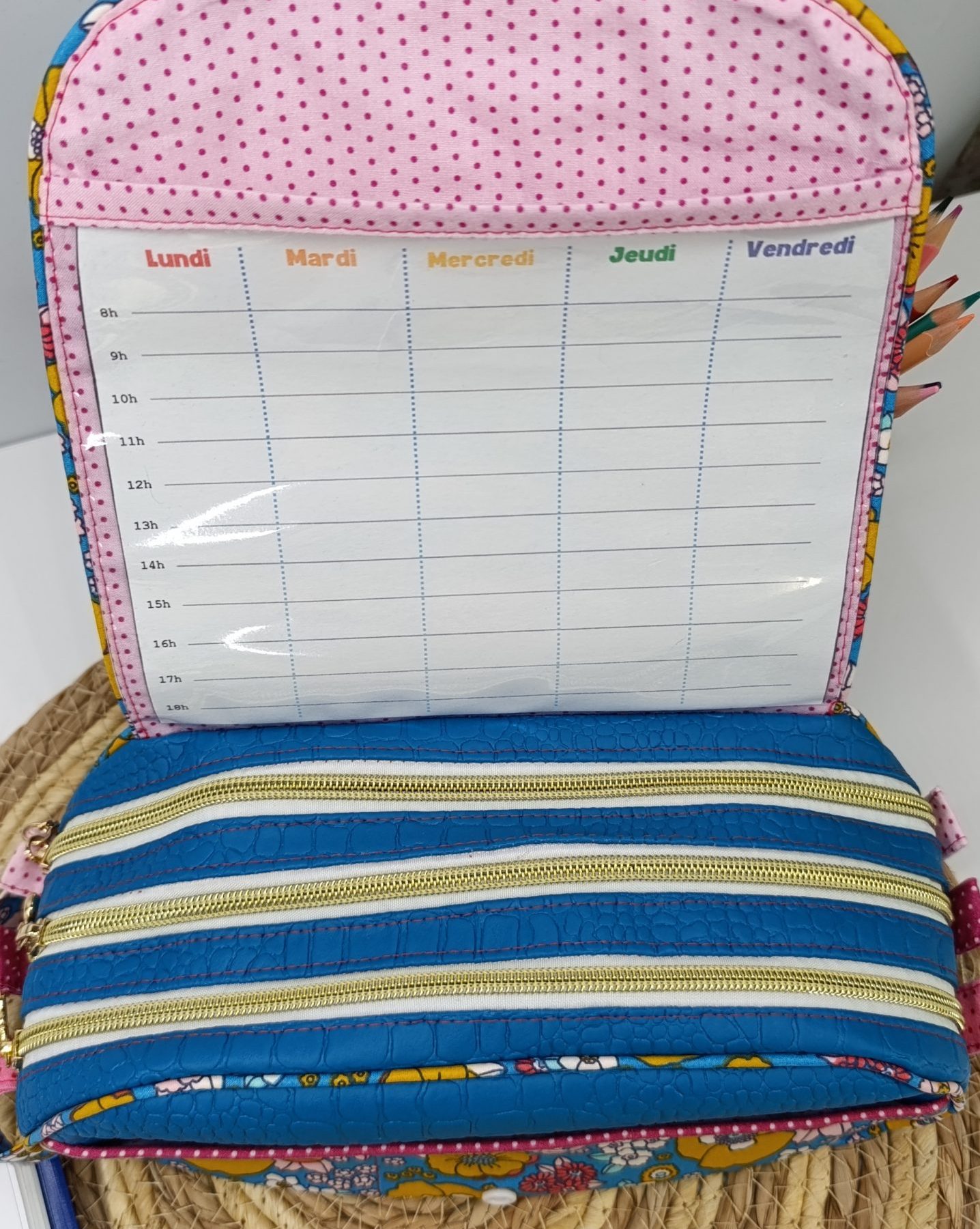 - Fonctionnelle : Un petit compartiment transparent dans le rabat pour y glisser fournitures, emploi du temps ou informations utiles imprimées et une ou deux petites poches avant.